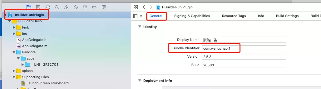 (1) 配置包名:点击左侧工程文件HBuilder-uniPlugin > 右侧头部General > Identity,修改Bundle Identifier字段值,如下图: