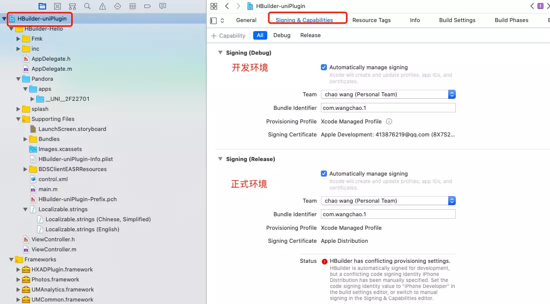 (2) 证书签名:点击左侧工程文件HBuilder-uniPlugin > 右侧头部Signing & Capabilities > Signing,选择对应证书相关信息,如下图: